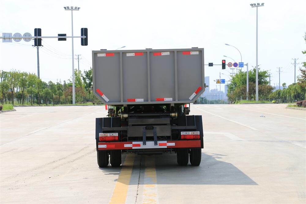 該款鉤臂式垃圾車由液壓系統、操作系統組成。舉升油制缸(1支)系國內知名液壓件廠家生產的雙作用油缸。垃圾廂可自吊上放下,可自行傾倒垃圾,上下一次工作循環時間≤50S。該車的特點是一個車能配多個垃圾廂,能實現一臺車與多個垃圾廂聯合作業,循環運輸,充分提高了車輛的運輸能力。
