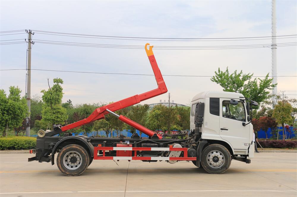 該款鉤臂式垃圾車由液壓系統、操作系統組成。舉升油制缸(1支)系國內知名液壓件廠家生產的雙作用油缸。垃圾廂可自吊上放下,可自行傾倒垃圾,上下一次工作循環時間≤50S。該車的特點是一個車能配多個垃圾廂,能實現一臺車與多個垃圾廂聯合作業,循環運輸,充分提高了車輛的運輸能力。