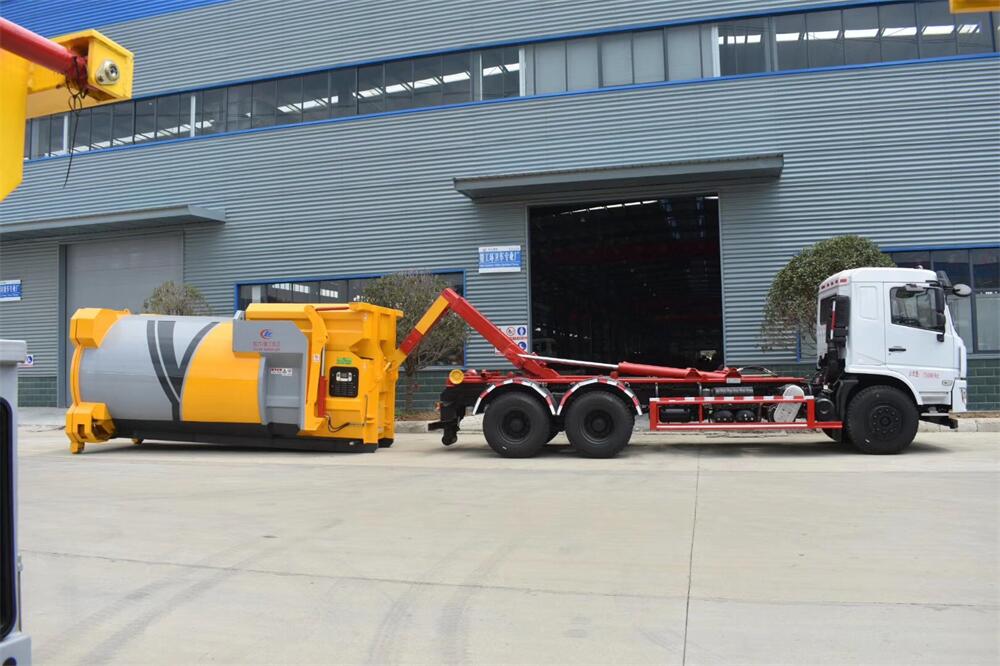 勾臂式垃圾車(車廂可卸式垃圾車)介紹: 車廂可卸式垃圾車又叫拉臂式垃圾車,是一種采用高新設(shè)計(jì)可伸縮的鉤臂,實(shí)現(xiàn)垃圾廂的二次吊裝,自吊上放下,可自行傾倒垃圾的環(huán)衛(wèi)設(shè)備。 拉臂式垃圾車結(jié)構(gòu)簡單,操作穩(wěn)定方便,裝卸效率高,機(jī)械化程度高,節(jié)省人力。鉤臂垃圾車一車可帶多個垃圾廂,在裝卸的運(yùn)輸過程中可有效地避免二次污染。 拉臂垃圾車采用高新設(shè)計(jì)可擺動的鉤臂,垃圾箱由框架、開啟油缸、滑輪、后門和若干加強(qiáng)框架與鋼板焊接而成。調(diào)換貨廂快捷方便,貨廂上帶蓋(倒垃圾時可翻開),鉤臂垃圾車?yán)鴰w可選用碳鋼、不銹鋼材質(zhì)、內(nèi)部采取環(huán)氧樹脂防腐處理,改裝部分與原車底盤為可分離式,維修方便且保持了原車的機(jī)動性及行駛性能。