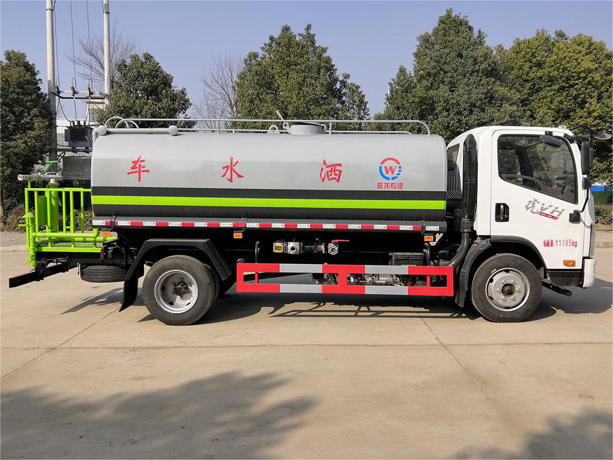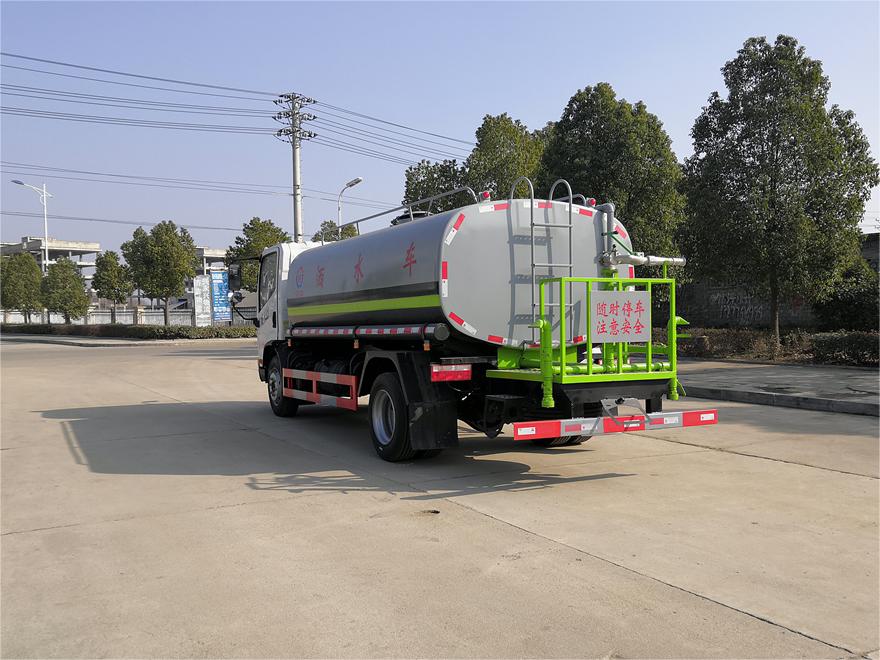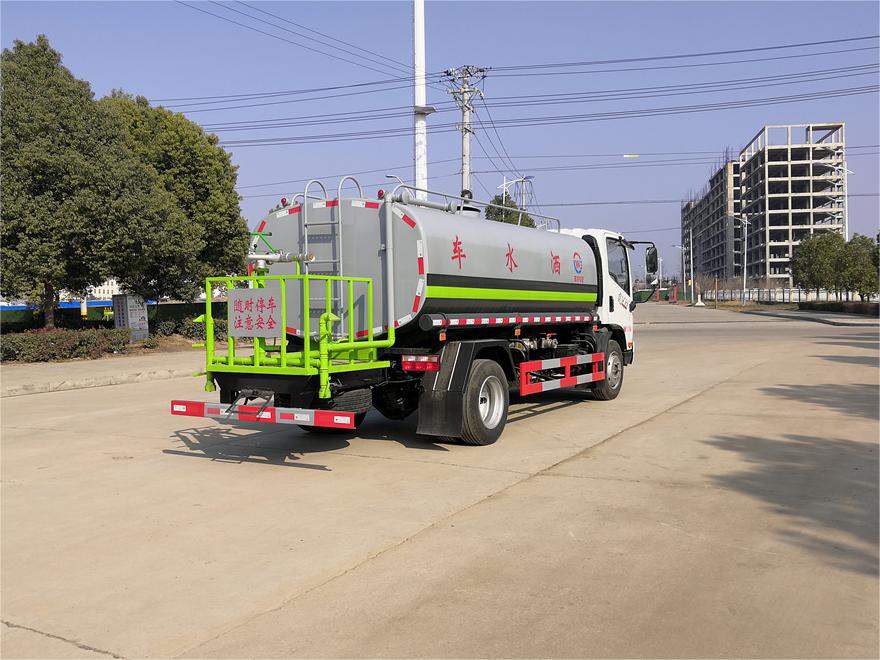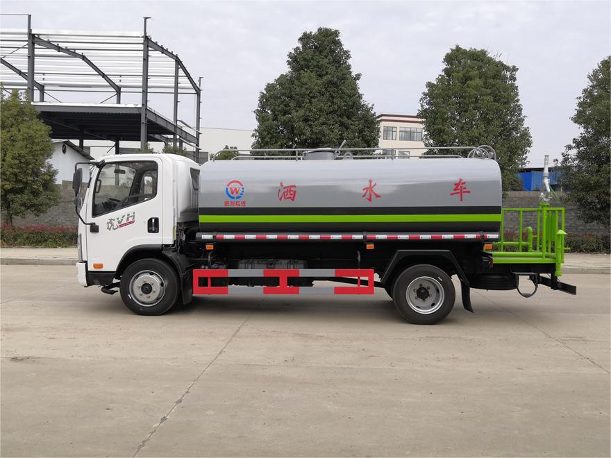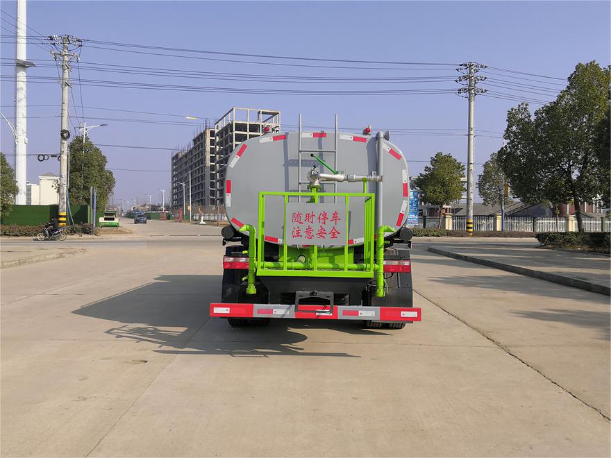灑水車前裝有鴨形噴嘴或圓頭沖嘴,后面裝有圓柱開(kāi)灑水噴嘴或蓮蓬頭噴嘴,后部有一工作平臺(tái),裝配有水炮。后部還可裝8個(gè)噴嘴(選裝)。