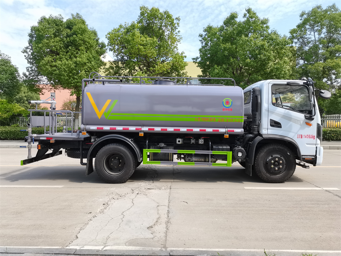 灑水車前裝有鴨形噴嘴或圓頭沖嘴,后面裝有圓柱開灑水噴嘴或蓮蓬頭噴嘴,后部有一工作平臺(tái),裝配有水炮。后部還可裝8個(gè)噴嘴(選裝)。