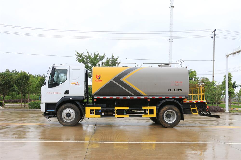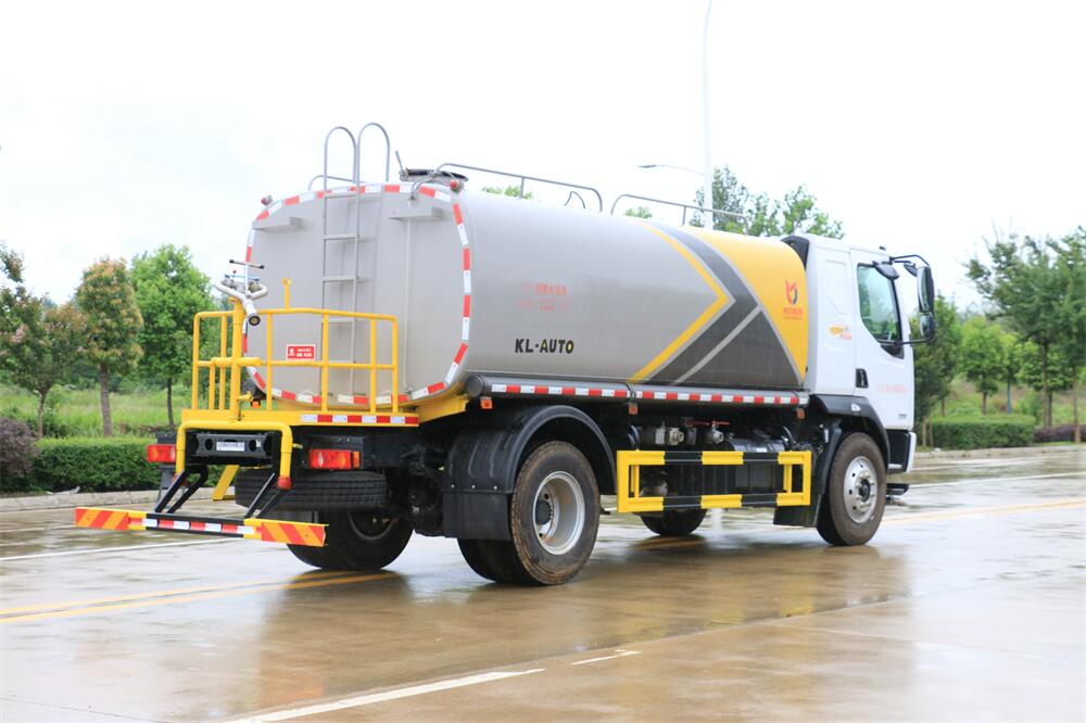 灑水車(chē)前裝有鴨形噴嘴或圓頭沖嘴,后面裝有圓柱開(kāi)灑水噴嘴或蓮蓬頭噴嘴,后部有一工作平臺(tái),裝配有水炮。后部還可裝8個(gè)噴嘴(選裝)。