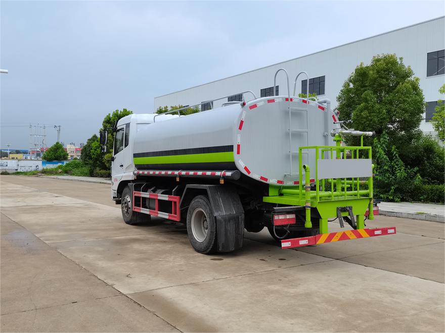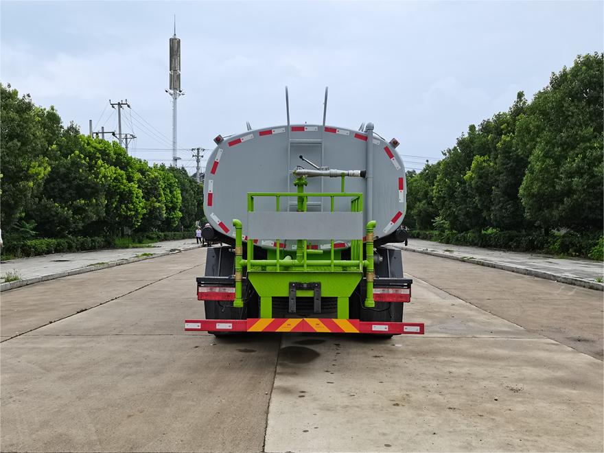 灑水車前裝有鴨形噴嘴或圓頭沖嘴,后面裝有圓柱開灑水噴嘴或蓮蓬頭噴嘴,后部有一工作平臺(tái),裝配有水炮。后部還可裝8個(gè)噴嘴(選裝)。