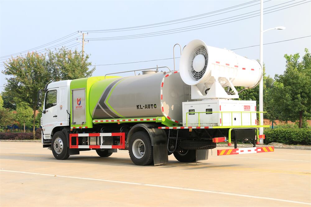 上裝配置:罐體容積為 12立方,選配風送式霧炮機組射程30米、40米、50米、60米、80米、100米、120米霧炮,罐體鋼板為4mm碳鋼Q235材質,罐內隔板具有防波作用,以減輕汽車行駛時罐體液體沖擊,罐體及整車外形尺寸按照公告。帶大功率專用灑水泵,泵可自吸自排,整車前沖、后灑、側噴、帶65消防接口,后平臺配CLW-50、CLW-60、CLW-80、CLW-100、CLW-120型風送式霧炮機組;罐體前封頭配大功率柴油發電機組;前封頭帶水位計,后平臺主管路帶1寸澆花接口,后爬梯。帶兩根輸水管及陰陽端。罐體顏色:銀/灰/綠,罐體兩側噴“多功能抑塵車”字樣,貼反光標示。