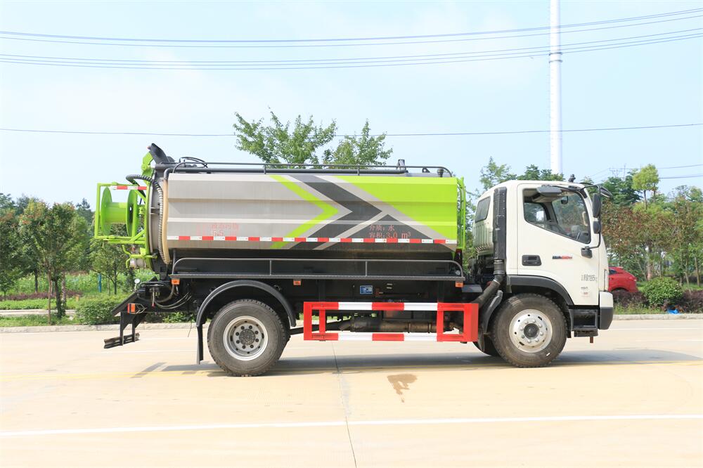 上裝配置:上裝配置:水罐4 立方,污罐 8立方;清洗 部份采用天津通潔,壓力 24Mpa,流量 215L/min,配80米直徑22高壓管帶液壓卷盤; 吸污部份采用山東 SK-15 水循環泵(億豐 10T 雙聯想真空泵),吸污罐帶舉升,后蓋液壓開 啟,帶一個 600mm 快開,罐體后尾部一個 DN150 排污口球閥,一個 DN100 進污口球閥,一個視 污窗,一根 10m 吸污管,一套陰陽端,壓力 表,防溢閥,箭頭燈,淋管裝置,高壓泵帶氣 吹水。配一個 4.5 公斤水雷噴頭,另帶一個 80 公分手持洗車噴頭。