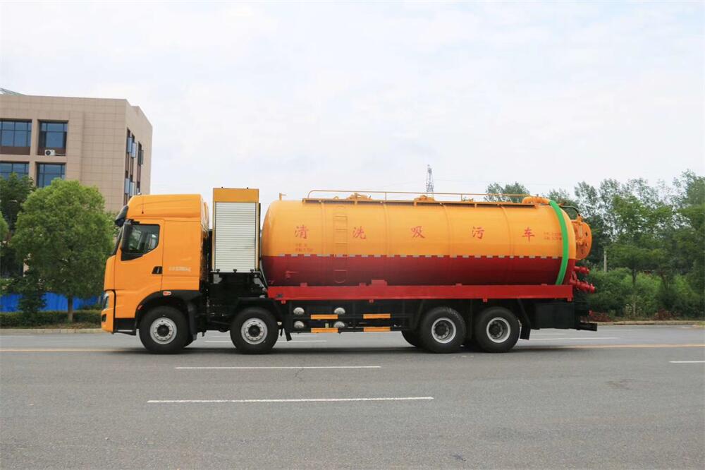 上裝配置:罐體容積為 30 立方(水污可自由 分配),罐體 8mm 厚,封頭 8mm 厚,水罐、污 罐可互通,用 100 球閥**開關;清洗部份采 用雙耀高壓泵,壓力 20Mpa,流量 330L/min, 配 80 米直徑 25 高壓管帶液壓卷盤;吸污部份 采用濰柴420馬力副發動機帶山東SK-42水循 環泵(副發自帶),吸污罐帶舉升,尾部加裝 一個 600mm 快開,罐體后尾部一個 DN150 不銹 鋼排污口,一個 DN150 不銹鋼偷排,兩個 DN100 吸污球閥帶出口盤,一個視污窗,兩根 10m 吸 污管,一套陰陽端,壓力表,防溢閥,箭頭燈, 工具箱,淋管裝置,高壓泵帶氣吹水。配一個 9 公斤水雷噴頭,另帶一個 80 公分手持洗車 噴頭。