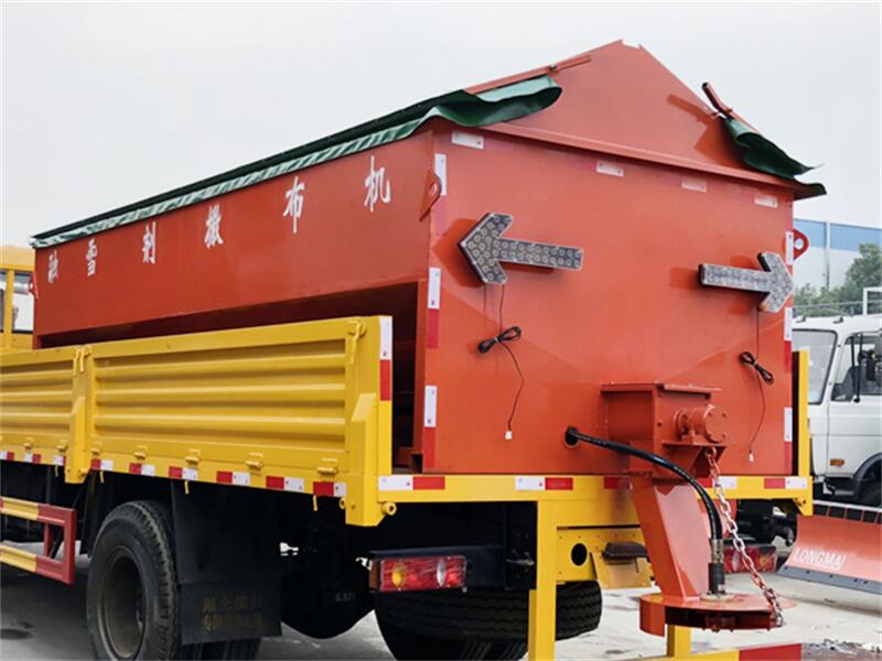 發(fā)動機帶動導輥旋轉(zhuǎn),把料箱中的融雪劑輸送到撒布斗,通過撒布斗的旋轉(zhuǎn)把融雪劑均勻撒布到路面。
